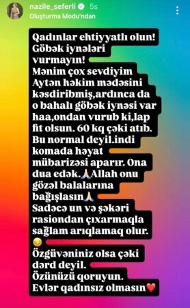 "Mənim çox sevdiyim həkim mədəsini kəsdiribmiş, ardınca da o bahalı göbək iynəsindən vurub ki, lap fit olsun. 60 kiloqram çəki atıb. Bu, normal deyil. İndi komada həyat mübarizəsi aparır. Allah onu gözəl balalarına bağışlasın.