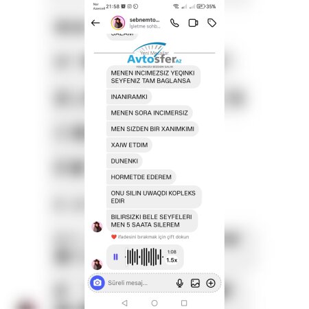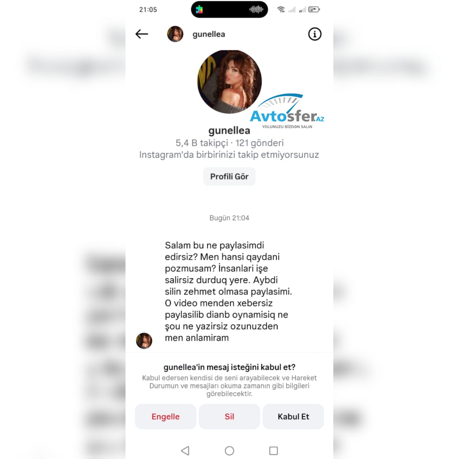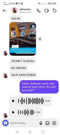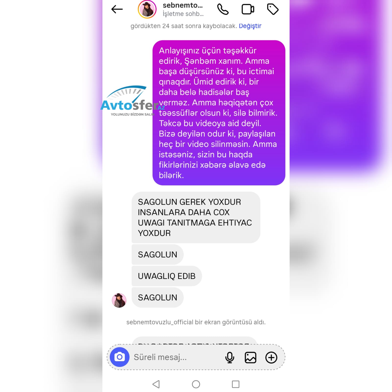Bu gün isə Şəbnəm xanım tərəfindən ünvanlanan növbəti mesajlarda təhdid xarakterli ifadələr yer alıb Mesajlarda səhifəmizin bağlatdırılacağı ilə bağlı iddialar səsləndirib, həmçinin “mənim Instagram səhifəm daha böyüktür, belə balaca səhifələri bağlatmaq mənim üçün oyuncaqdır” məzmunlu ifadələr işlədib.