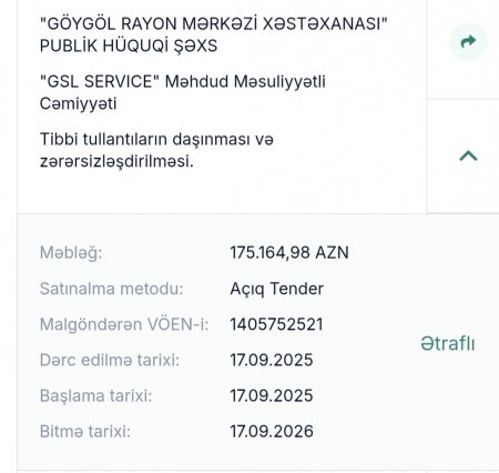 17 sentyabr 2025-ci il tarixində açıqlanan tender məlumatlarına əsasən, Göygöl Rayon Mərkəzi Xəstəxanası tərəfindən "GSL Service" MMC ilə tibbi tullantıların daşınması və zərərsizləşdirilməsi məqsədilə 175.164,98 AZN məbləğində müqavilə bağlanıb.