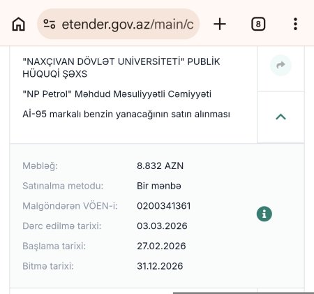 32gun.az xəbər verir ki, Ali təhsil müəssisəsi Aİ-95 markalı benzin yanacağının satın alınması məqsədilə "NP Petrol" Məhdud Məsuliyyətli Cəmiyyəti ilə 8.832 AZN məbləğində müqavilə bağlayıb.