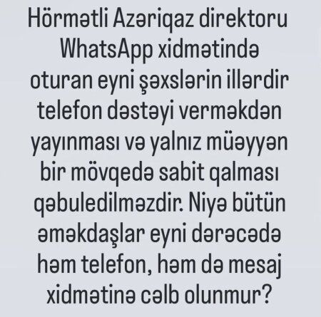 Müraciətdə daha sonra deyilir: "Lakin baş dispetçerlərin və "votsap" üçün nəzərdə tutulmuş kompüterlərin internetə çıxışları açıqdır. Bu hal isə əməkdaşlar arasında ayrı-seçkilik yaratmaqla yanaşı, ciddi narazılıqlara səbəb olmaqdadır.
