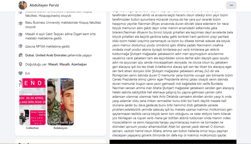 Özünü “Ştutqart” mağazalar şəbəkəsinin sahibi kimi tanmınan keçmiş Masallı rayonundan millət vəkili olmuş Nəriman Əliyevin bacısı oğlu olduğunu yazan Parviz Abdullayev profilində maraqlı bir paylaşım edilib.
