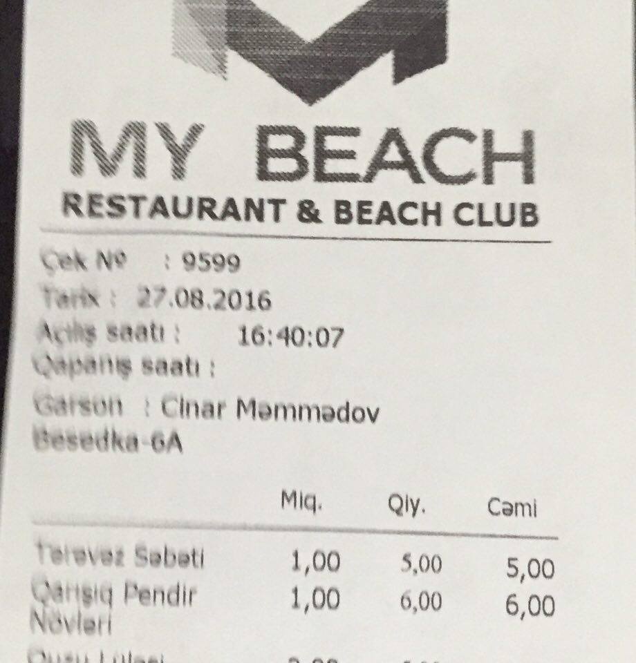 Bir neçə gündür ki, ölkənin aparıcı KİV-ləri Novxanıda yerləşən My Beach adlı çimərlikdə yaşanan dərəbəylik və soyğunçuluq haqda reportajlar dərc edir. Qeyd edək ki, həmin komplekse çimərliklə yanaşı həm də restoran aiddir. Azinforum.az-ın əməkdaşlarının həmin kompleksə aid restoranda apardıqları araşdırma zamanı məlum olub ki, My Beach-in restoranında olan soyğunçuluq heç də çimərliyindən geri qalmır. Özünü elit sayan bu restoranda masaya xidmət edən ofisiant tapmaq müşkül məsələdir. Maraqlıdır ki, dənizin kənarında olan restoranda çay sifarişi qəbul olunmur. Xidmətçilər bildirirlər ki, çay (özü də baha qiymətə- Azinforum.az ) yalnız yemək yedikdən sonra verilə bilər. Bu yaxınlarda jurnalist həmkarlarımızdan birinin yazdığına görə, o My Beach-in çimərliyinə 10 manat ödəyib girərkən, dərin yoxlamaya məruz qalıb və onun çantasında olan uşağı üçün götürdüyü yoqurd və soku “müsadirə” ediblər. Aydındır ki, bunların hamısı kompleksin “ceyranın belində” olan qiymətlərində satılan məhsulları müştərilərə sırımaq üçün edilir.