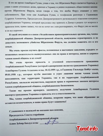 Bildirək ki, bu arada Ukrayna Respublikasının Dnepropetrovsk vilayətində yaşayan Azərbaycanlıların diaspor təşkilatlarının ümumi yığıncağı olub. Yığıncağda Qulam Ələkbərovun cinayət əməlləri barədə təkzibolunmaz faktlar içtimaiyyətin diqqətinə çatdırılıb.