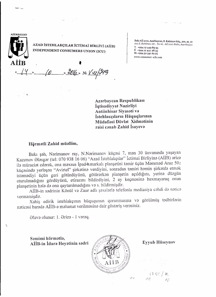 В«Mənə dedilər ki, müqaviləyə əsasən 2-3 iş günü müddətində planşetə diaqnoz qoyulduqdan sonra sizinlə əlaqə saxlanılacaq və dedilər ki, planşetin bizim şirkətdə düzəlməsinin xərci sizə deyiləcək, bizim şirkətdə təmir etmək fikriniz olmasa sadəcə diaqnoz üçün 20 AZN ödəyəcəksiniz. 7 iş günü keçməsinə baxmayaraq, mənimlə heç kim tərəfindən əlaqə saxlanılmadı. Sonra В«AvirtelВ» şirkətinə yaxınlaşdım və məndən Sara xanım təmir üçün 90 AZN pul tələb etdi. Onlara В«sizdə təmir etmək istəmirəmВ» dedikdə məndən 20 AZN tələb etdilər, müqaviləyə əsasən razılaşdım. Planşeti qaytardıqda gördüm ki, planşet açılıb, yerinə düzgün otuzdurulmayıb və bəzi düymələri işləmir. Bizim orda cüzi mübahisəmiz oldu bunu yuxarıdan kamera vasitəsi ilə görən В«AvirtelВ» şirkətinin prezidenti İsmayıl Şabani bəy texnik ilə məni otağa dəvət etdi. İsmayıl bəy məni dinlədikdən sonra işçilərə tapşırıq verdi ki, bu ağsaqqalın planşetində olan bütün problemləri aradan qaldırırsınız və 1 manat almadan özünə qaytarırsınız. 2 aya yaxındır ki, mənim planşetimi düzəldib özümə qaytarmırlar. Bu 2 aya yaxın müddətdə mən öz dəyərli vaxtımı itirib 7 dəfə В«AvirtelВ» şirkətində olmuşam. Rəşad adında texnik müxtəlif bəhanələrlə məni əliboş yola saldı. Sonuncu dəfə 06.10.16 mən orda olduğum zaman texniki şöbənin müdiri Samir bəy yaxınlaşdı və dedi ki, mən söz verirəm ayın 7-si sizin planşetinizi təmir edib 8-i özümdə saxlamaqla işlədib bir daha yoxlayacam. Ayın 9-u istirahət günü olduğundan ayın 10-u səhər tezdən gəl, planşetini apar. Mən ayın 10-u saat 10 radələrində şirkətdə olmuşam. 12:30-a qədər məni gözlətdikdən sonra yenə də əliboş yola saldılar. Dedilər ki, düzəldəcəyik, müqaviləmi də vermədilər. Mən eyni markalı planşetin təzəsinin verilməsini istəyirəm, çünki planşeti onlar yararsız hala salıblar. Xahiş edirəm mənim istehlakçı hüquqlarımın qorunmasında köməklik edəsiniz və bu barədə müvafiq dövlət orqanlarına məlumat verəsinizВ».