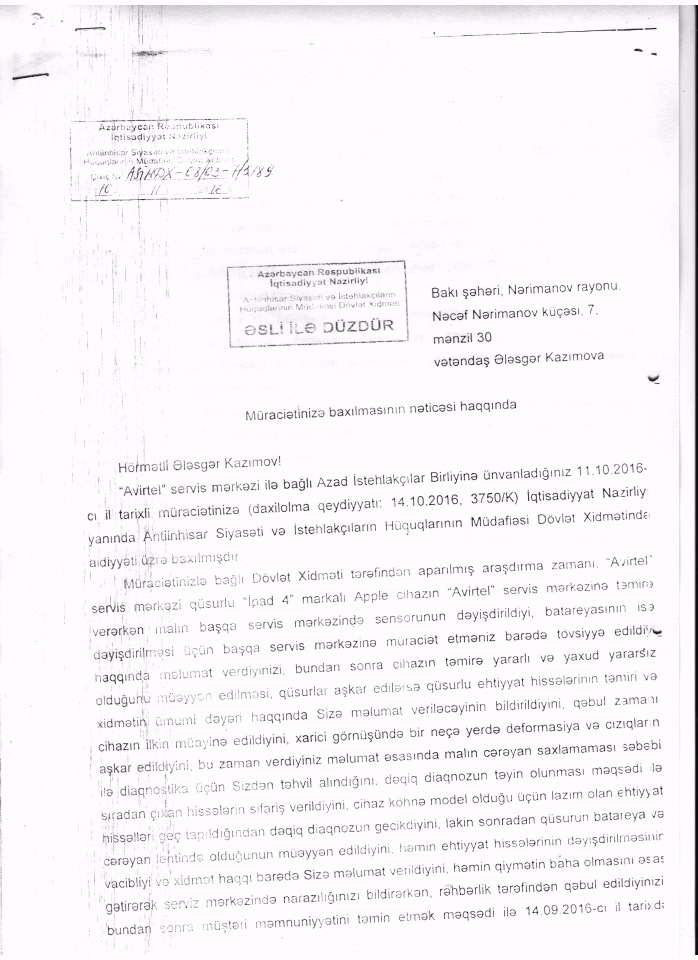 Bakı şəhəri, Nərimanov rayonu, Nəcəf Nərimanov küçəsi 7, mənzil 30 ünvanında yaşayan Ələsgər Kazımov Gundelik-Baku.com-un redaksiyasına, o cümlədən В«Azad İstehlakçılarВ» İctimai Birliyinə ərizə ilə müraciət edib. Beləliklə, В«Mən vətəndaş Kazımov Ələsgər M.C oğlu bu ilin fevral ayında internet vasitəsi ilə 600 AZN məbləğinə aldığım İpad4 planşeti heç bir qüsuru olmadan avqustun əvvələrinə qədər işlətmişəm. Avqust ayında planşetdə yaranan cüzi enerjini az saxlama problemi yaranmışdır. Mən öz İpad4 planşetimi götürüb Məmməd Araz 50 c küçəsində yerləşən В«AvirtelВ» şirkətinə yaxınlaşıb təmir üçün müraciət etdimВ» deyən şikayətçinin sözlərinə görə, adıçəkilən şirkət onunla müqavilə bağlayıb planşeti götürüblər: