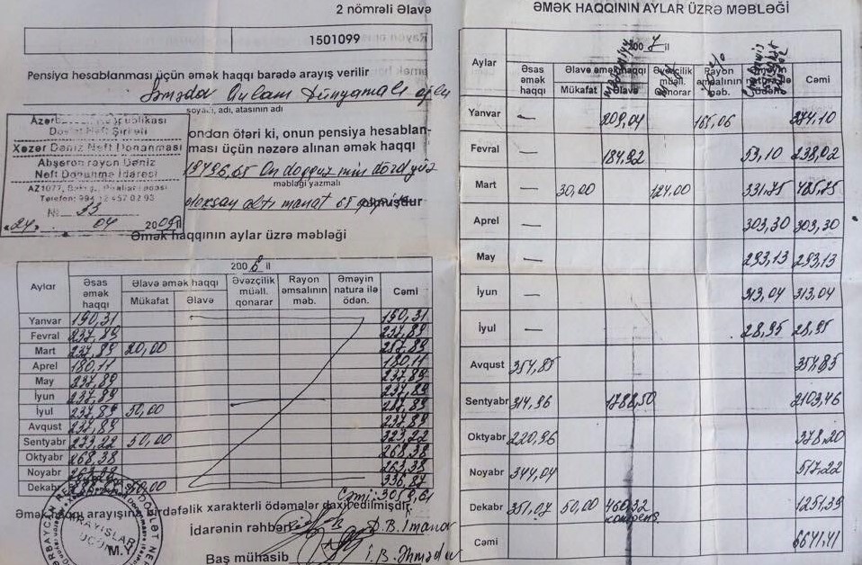 Azərbaycan Dövlət Neft Şirkətindən pensiya yaşına çatdığı üçün işdən çıxarılan Qulan Səmədov Dünyamalı oğlu ona ödəniləcək məbləğin tam şəkildə verilmədiyini bildirib. Beə ki, ona 1350 manat ödənilməli olduğu halda, cəmi 396 manat ödənilib.