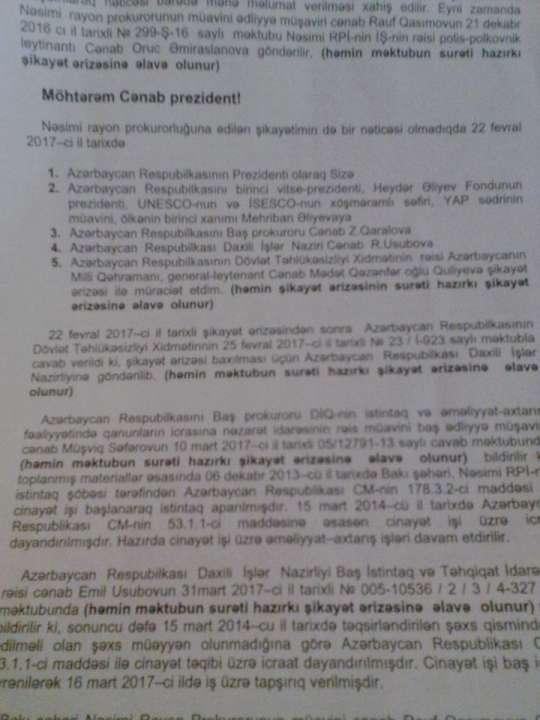 Xüsusi olaraq qeyd edim ki, şikayət etdiyim Ümidəli Aydın oğlu barəsində Bakı şəhəri Nəsimi RPİ-nin İŞ-nin müstəntiqi Rəşad Həsənovun icraatında olan 130070665 saylı cinayət işi mövcud olmasına baxmayaraq eyni zamanda həmin iş materiallarından göründüyü kimi Nəsimi RPİ-nin 22-ci PB-nin təhqiqatçısı və Nəsimi RPİ-nin İŞ-nin müstəntiqi tərəfindən Abbasov Ümidəli Aydın oğlundan izahat alınmasına baxmayaraq mənə ünvanlanan cavab məktublarlnda qeyd edilir ki, 15 mart 2014-cü il tarixdə təqsirləndirilən şəxs qismində cəlb edilməli olan şəxs müəyyən olunmadığına görə Azərbaycan Respublikası CM-nin 53.1.1-ci maddəsi ilə cinayət təqibi icraat təqibi dayandırılmışdır. Cinayət işi baş idarədə öyrənilərək 16 mart 2017-ci ildı iş üzrə tapşırıq verilmişdir. Halbu ki, Abbasov Ümidəli Aydın oğlundan izahat alınarkən şəkili çəkilib və məndən iki dəfə 4 min manat aldığını və Əzizə veridiyini izahatında etiraf edib. Hörmətli cənab prezident!