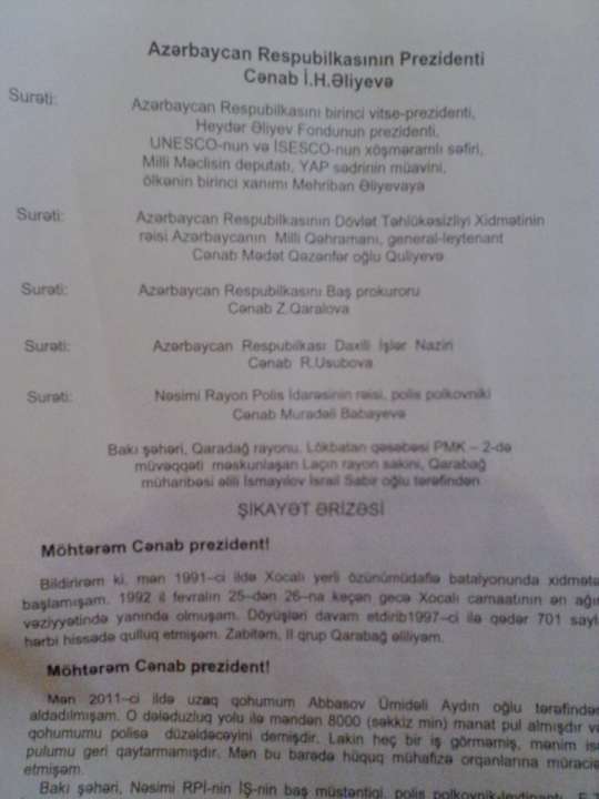 Redaksiyamıza şikayət məktubu ünvanlayan Bakı şəhəri Qaradağ rayonu Lökbatan qəsəbəsi PMK-2-də müvəqqəti məskunlaşan Laçın rayon sakini Qarabağ müharibəsi əlili İsmayılov İsrail Sabir oğlu ölkə başçısından kömək istəyib.