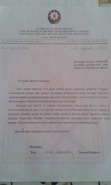 Yazıdan sonra R. Əliyev təkrar əlaqə saxlayaraq məsələ haqda daha ətraflı bilgi vermək istədiyini dedi. Biz də dinlədik. Şikayətçi iddia edir ki, uzun illərdir Ayaz Orucovla aralarında yaranan münaqişə məhkəməsiz çözülə biləcək bir problemi müşkülə çevirib: “Mərhum atam 1995-ci ildə Beyləqan şəhərinin mərkəzində Dövlət Reyester Xidmətində 3-15, inventar nömrəsi -15 olmaqla qeydiyyatdan keçmiş mülk almışdı. Atamın orda “İşaatçı” koperativi vardı. Ora Beyləqan şəhər İdman Sağlamlıq Zonasında yerləşən ərzaq və sənaye malları bazarı kimi qeydiyyata alınıb. İndi həmin ərazini Beyləqan rayonundan olan sabiq millət vəkili Ayaz Orucov ələ keçirib”.