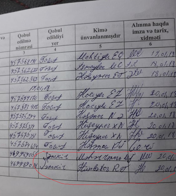 Şəmkir rayon məhkəməsinin hakimi Nemət Paşayev bu barədə Tovuz rayon Poçt şöbəsinə sorğu edəndə, poçtalyon Elməddin Süleymanov izahat vermişdir ki, guya xəbərnamə ilə yollanılmış qətnamələri 20.01.2018-ci ildə özümüzə vermiş və almağımız barədə jurnalda imzalatdırmışdır. Lakin baxış zamanı poçt jurnalındakı imzaların bizim olmadığı aşkar olundu, yəni jurnala Elməddin Süleymanov özü imza etmişdir. Həmin imzalanmış səhifənin fotoşəklini müraciətimə əlavə edirəm.