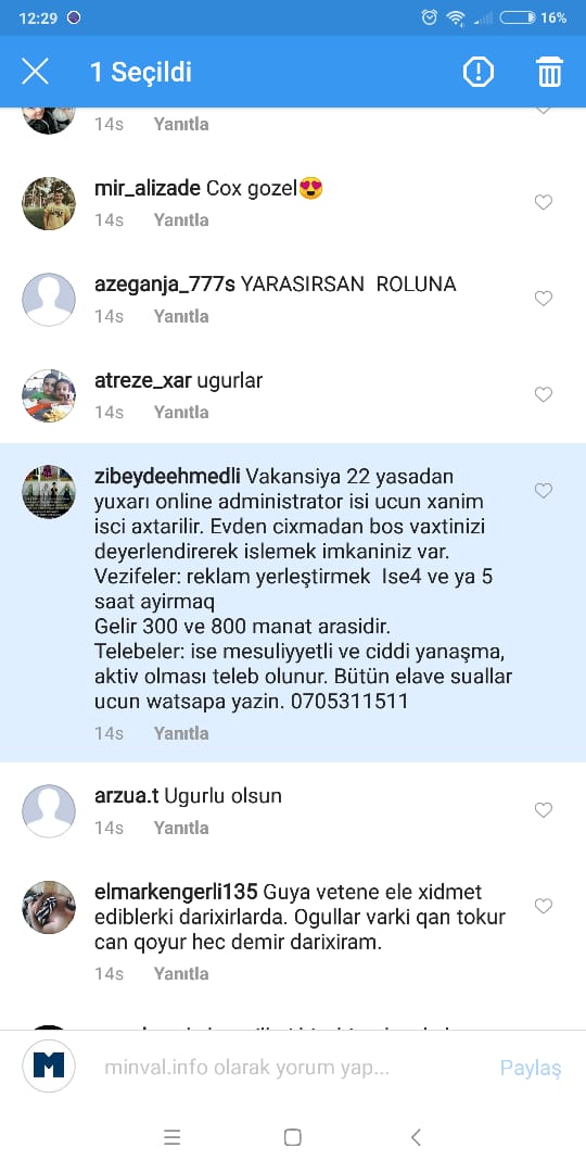 Minval.İnfo xəbər verir ki, son günlər hər yerdə, əsasən də “İnstagram”da fotoların altında göbələk kimi çıxan şəxslərin yazdığı şərhlərdə sadəcə xanımlar üçün olan iş elanları paylaşılır.