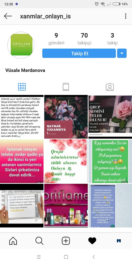 Yəni sən onlardan nəsə alırsan və ya alan birini tapırsan, beləcə guya qazanırsan. Sadəcə qadınları hədəf alan bu onlayn mağaza Azərbaycanda İsveç şirkəti olan “Oriflame”- əmədaşlıq etdiklərini deyir. Maraqlısı budur ki, iş elanlarında sadəcə qadınlar tələb edirlər. Üstəlik iş axtaran və yaxud evdar qadınları menecer vəzifəsi təklif edərək cəlb edirlər. Sloqanları da belədir “siz evdən çıxmadan pul qazanacaqsınız”. Aydındır ki, evdar qadınları ancaq bu yolla aldada bilərlər.