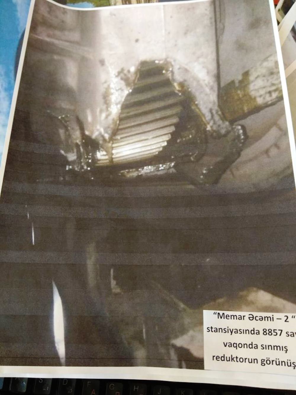16.08.2017-ci il tarixdə maşinist Rafiq Hüseynov və maşinist köməkçisi Valeh Heybətov “Memar Əcəmi-2" stansiyasını 73 metr keçmiş, qatar tuneldə iki yolun arasında yığılmış relslərə dəyərək dayanıb. Nəticədə 8857 saylı vaqonun 1-ci təkər cütünün reduktoru sınıb, 2-ci təkər cütünün reduktoru zədələnib və digər aparatlar da zədə alıb. Bu cür faktlar çoxdur və xahiş edirik ki, müvafiq qurumlar tədbir görsünlər. Əks halda, metroda böyük faciə yaşanacaq”.