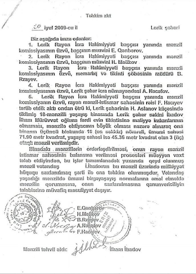 “2009-cu ildə Lerik şəhərinin mərkəzində, sosial binada mənə üçotaqlı ev verilib. Mənzili alan zaman sənədə Lerik Rayon İcra Hakimiyyətinin beş nəfər rəsmi nümayəndəsi qol çəkib. Sənəddə göstərilir ki, binadakı mənzillərin orderləşdirilməsi, rayon mənzil-istismar sahəsinin balansına verilməsi prosesləri tamamlanadək ev mənim hüquqi mülkiyyətim hesab edilir.