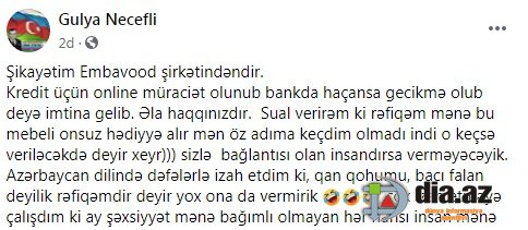 "Şikayətim "Embavood" şirkətindəndir. Kredit üçün online müraciət olunub, bankda haçansa gecikməm olub deyə imtina gəlib. Əla, buna sözüm yoxdur, haqlısınız...