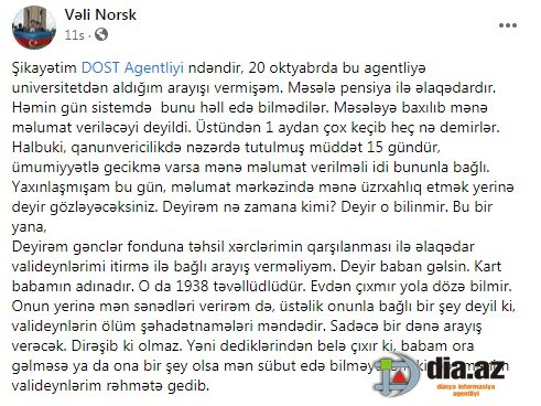DİA.AZ: - "Şikayətim "DOST Agentliyi"ndəndir, 20 oktyabrda bu agentliyə universitetdən aldığım arayışı vermişəm. Məsələ pensiya ilə əlaqədardır. Həmin gün sistemdə bunu həll edə bilmədilər. Məsələyə baxılıb mənə məlumat veriləcəyi deyildi". DİA.AZ bildirir ki, bu barədə Vəli Norsk adlı istifadəçi sosial şəbəkələrdə paylaşım edib.