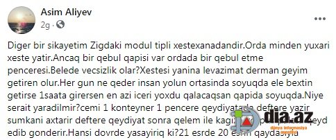 DİA.AZ: - "Şikayətim Zığdakı modul tipli xəstəxanadandır. Bildirim ki, orada 10 mindən yuxarı xəstə yatır. Ancaq bir qəbul qapısı var və bu qəbul qapısının da bir qəbuletmə pəncərəsi var". DİA.AZ bildirir ki, bu sözlər Bakı sakini Asim Əliyevin çikayətində yer alıb.
