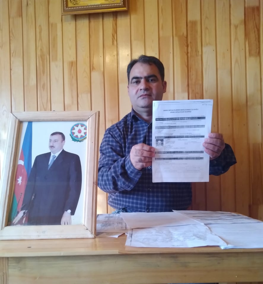 Cəlilabad rayon Muğan kənd sakini Ağayev Hidayət İskəndər oğlu Muğan kəndinin keçmiş bələdiyyə sədri, hazırda isə bələdiyyədə mühasib işləyən Maşlıq kənd sakini Rasif Həsənovdan Baş prokuror Kamran Əliyevə şikayət edib.