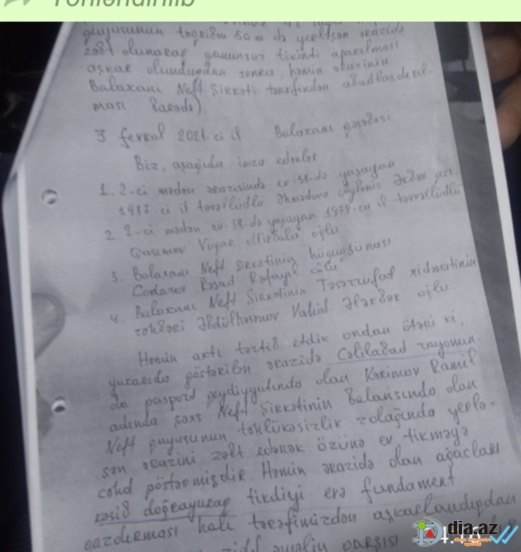 Onu da qeyd etmək yerinə düşər ki, həmin ərazilər В«BalaxanıneftВ» Neft-Qaz Çıxarma idarəsinin balansında olsa da, indiyə kimi həmin ərazilərdə çoxsaylı yaşayış evləri inşa olunub, bu gün də inşa olunmaqdadır. Qaldı ki, Ramil Kərimov adlı şəxsin ərsəyə gətirdiyi yaşıllıqların məhv edilməsinə, bu başqa bir söhbətin mövzusudur. Yəni, dolaşan söz söhbətlərə görə təqribən 15-16 il ərzində ərsəyə gətirilmiş yaşıllıqların məhv edilməsində, В«BalaxanıneftВ» Neft-Qaz Çıxarma idarəsində vəzifə sahibi olan bəzi şəxslərin xüsusi marağı olur. Ona görə də həmin şəxslər bu yöndə addımlarını atmazdan öncə, həm Balaxanı bələdiyyəsi sədrinin imkanlarından, həm də qeyd olunan ərazidə yaşayan bəzi sakinlərin rolundan məharətlə istifadə etməyi bacarırlar. Bunun üçün onlar ilk əvvəl qonşular adından ərizə yazırlar və həmin ərizədə qeyd olunur ki, “BalaxanıneftВ» Neft-Qaz Çıxarma idarəsinin 2-ci mədən sahəsində, 41 saylı neft quyusunun həndəvərində yaşayan, həmçinin Sabunçu rayonunda qeydiyyatda olan Ramil Kərimov adlı şəxs ərazidəki ağacları kəsib doğramış və həmin yerdə qanunsuz tikinti işləri aparmaq qərarına gəlmişdir. Ona görə də, bu şəxsin qanunsuz əməllərinin qarşısının alınması, ərazidə əmələ gələn törtöküntülərin aradan qaldırılması, eyni zamanda ərazidə abadlıq və yaşıllaşdırma işlərinin aparılmasını xahiş edirik”. Onu da bildirək ki, yazılmış ərizə haqda bəzi qonşuların xəbəri olmur, bəzi qonşuları isə müxtəlif adlar altında aldadılır və belə bir yolla da həmin ərizəyə imza çəkdirirlər. Ərizəyə imza atan şəxslər A.Əhmədova, P.Qasimov, A.Səlimov, S.Hacıyeva, Nəsibə Əliyeva, M.Kamranova, Ruslan Eyyubov və Rəhilə Bəhrəmova olurlar.