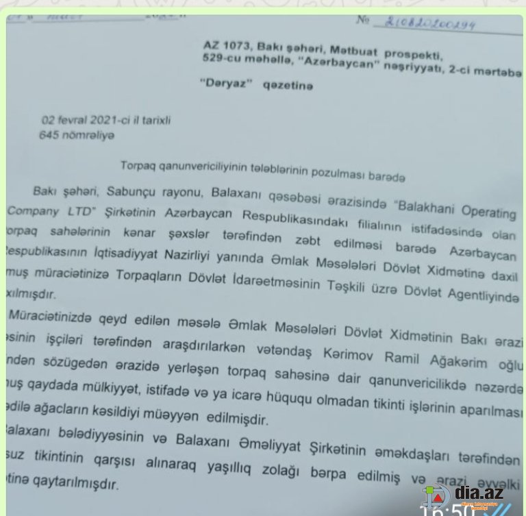 Digər tərəfdən, bu yöndə atılan addımlarla bağlı həyata keçirilmiş video-çəkilişlərə diqqət yetirib realllığı gördükdən, həmçinin əməkdaşımızın əldə etdiyi məlumatlara istinad etdikdən sonra, mövcud problemin araşdırılması məqsədilə Azərbaycan Respublikasının İqtisadiyyat Nazirliyinə məktub ünvanladıq. Ünvanladığımız məktuba verilmiş cavabda qeyd olunub: “Bu məsələ ilə əlaqədar məktuba Azərbaycan Respublikasının Əmlak Məsələləri Dövlət Komitəsi Yanında Torpaqların Dövlət İdarəetməsinin Təşkili üzrə Dövlət Agentliyində baxılmış, həmçinin bu məsələ ilə bağlı Əmlak Məsələləri Dövlət Xidmətinin Bakı ərazi şöbəsinin əməkdaşları tərəfindən araşdırmalar aparılarkən bəlli olur ki, vətəndaş Kərimov Ramil Ağakərim oğlu tərəfindən sözügedən ərazidə yerləşən torpaq sahəsinə dair qanunvericilikdə nəzərdə tutulmuş qaydada mülkiyyət, istifadə və ya icarə hüququ olmadan tikinti işlərinin aparılması məqsədilə ağacları kəsildiyi müəyyən edilmişdir. Balaxanı bələdiyyəsinin və Balaxanı Əməliyyat Şirkətinin əməkdaşları tərəfindən qanunsuz tikintinin qarşısı alınaraq yaşıllıq zolağı bərpa edilmiş və ərazi əvvəlki vəziyyətinə qaytarılmışdır”. Qeyd edək ki, ünvanladığımız məktuba 01 mart 2021-ci il tarixdə Azərbaycan Respublikasının Əmlak Məsələləri Dövlət Komitəsi Yanında Torpaqların Dövlət İdarəetməsinin Təşkili üzrə Dövlət Agentliyinin direktor müavini Şamil Abdullayevin imzası ilə təsdiq olunmuş в„– 210820200294 saylı məktubla cavab verilib.