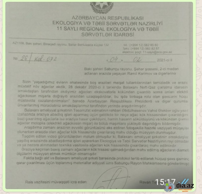 Elə ki, 28 dekabr 2020-ci il tarixdə Balaxanı Neft-Qaz Çıxarma idarəsinin əməkdaşları, Kərimov Ramil Ağakərim oğlunun təqribən 15-16 il ərzində ərsəyə gətirdiyi yaşıllıqları məhv edirlər, o halda o, bu yöndə atılmış addımdan gec xəbər tutur və ləngimədən qeyd olunan əraziyə gəlir. Hətta o, ərsəyə gətirdiyi yaşıl ağacların ağır texnikanın vasitəsilə kökündən çıxarılması ilə bağlı video-çəkiliş də həyata keçirir. Az sonra o, mövcud problemlə bağlı yazmış olduğu ərizəsini, həmçinin həyata keçirdiyi video-çəkilişi diskə köçürüb Azərbaycan Respublikasının Ekologiya və Təbii Sərvətlər nazirliyinə ünvanlayır. Bu şəxsin göndərdiyi şikayət ərizəsinə, 04 fevral 2021-ci il tarixdə 11 saylı Regional Ekologiya və Təbii Sərvətlər İdarəsində rəis vəzifəsini müvəqqəti icra edən Rəvan Tağıyevin imzası ilə təsdiq olunmuş в„– 26/kol-072 saylı məktubla cavab verilir. Cavab məktubunda qeyd olunur: “Məsələ ilə əlaqədar Balaxanı Neft-Qaz Çıxarma idarəsinin Təsərrüfat xidmətinin rəhbəri Əbdülhəsənov Vahid Ələkbər oğlu yazdığı izahatında bildirir ki, “Abadlıq işləri aparmaq məqsədilə əraziyə gəldikdə gördük ki, bir neçə ağac kök hissəsindən çıxarılmış, bəzi çıxarılmış ağaclarla əraziyə hasarlar çəkilmiş, həmin hasarlar sökülmüş və kökündən çıxarılmış ağaclar elektrik ağackəsən mişarı ilə kəsilmiş və maşınlara yığılaraq ərazidən daşınmışdır”. Elə ki, tərəfimizdən araşdırmalar aparılarkən ərazinin əvvəlki görünüşü ilə sonrakı görünüşünü müqayisə etdik, o halda bəlli oldu ki, ağaclar kök hissəsindən çıxarılaraq məhv olunmuşdur. Təqdim olunan video-görüntülərdən də bəlli olur ki, Balaxanı əməliyyat şirkətinin əməkdaşları ETSN-nin rəyi olmadan və nəzərə almadan, həmin ağacları texnika vasitəsilə kökündən çıxarıb məhv etmişlər. Faktla bağlı Balaxanı əməliyyat şirkəti barəsində protokol tərtib edilərək hüquqi şəxs qismində qərar çıxarılması üçün, toplanmış materiallar aidiyyatı üzrə Sabunçu rayon Məhkəməsinə göndərilmişdir”.