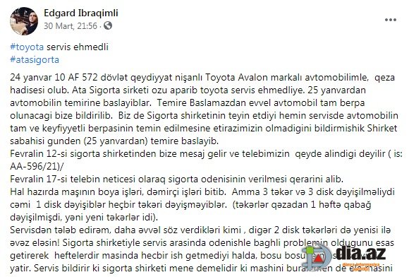 DİA.AZ: - "24 yanvar 10 AF 572 dövlət qeydiyyat nişanlı "Toyota Avalon" markalı avtomobilimlə, qəza hadisəsi olub. "Ata Sigorta" şirkəti özü aparıb "Toyota Servis Ehmedli"yə". DİA.AZ bildirir ki, bu sözləri Edqard İbrahimli sosial şəbəkələrdəki paylaşımında qeyd edib.