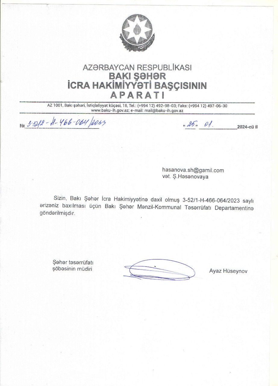 “Bakı İcra Hakimiyyətinə, "Azəriqaz" "Azəristiliktəchizat"-a, В В Nazirlər Kabinetinə və digər yerlərə çoxsaylı В müraciətlər, şikayətlər В etsək də, problemimiz telekanallarda işıqlansa da bizim illərdir çəkdiyimiz bu zülmə bir tədbir görülmür.