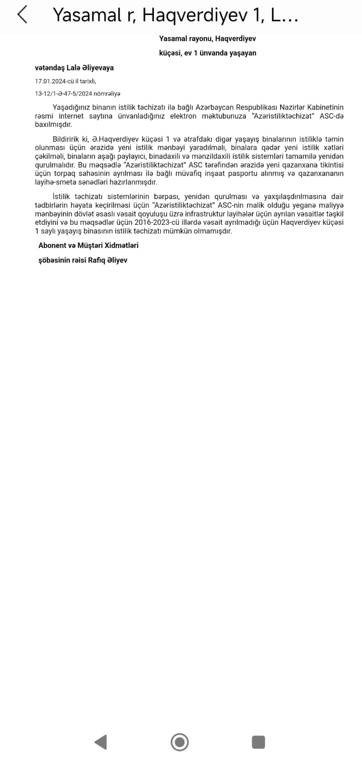Əslində bir vətəndaş olaraq bizim istiliklə təmin olunmağımız bizim qanuni hüququmuzdur, haqqımızdır.Bu binanın tam qaydasında olan sənəddə də öz əksini tapıb.