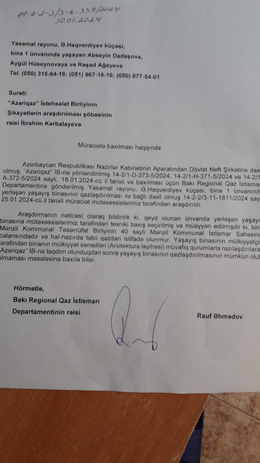Amma deyilən В məbləğ külli miqdarda olub deyə bizim buna imkanımız çatmayıb. Qaz çəkilərsə biz hətta borunun balkonacan çəkilməsinə də razıyıq.Necə ki, indi bir çox hümdürmərtəbəli binalarda belə edilir.