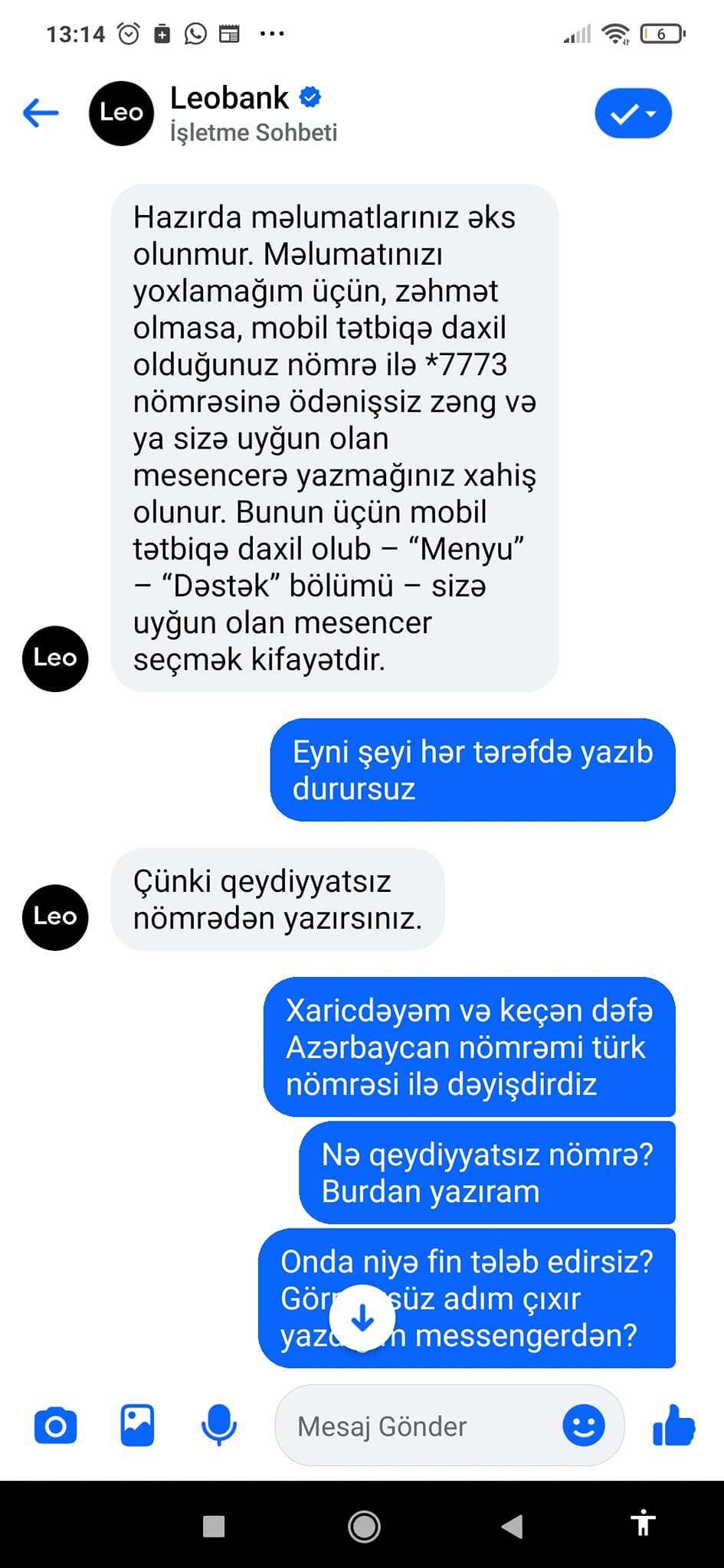 "Şikayətim "Leobank"dandır. Mən hazırda xaricdəyəm, bütün pulum bu kartdadır..." Dia-az.İnfo xəbər verir ki, bu barədə "Müştəriyəm Şikayətim Var" sosial qrupunda giley olunur. Narazı vətəndaş daha sonra başına gələnləri belə nəql edir: "Son günlərdə hər dəfə bir problemi çıxır. Keçən dəfə durduq yerə tətbiqə daxil ola bilmədim. Yazdım, dedilər zəng edəcəklər, 1 gün sonra baxdım səs soraq yoxdur, təkrar yazandan sonra zəng etdilər. 1 gün pulsuz parasız qaldım. Heç problemin nədən qaynaqlandığını demədilər, sadəcə Azərbaycan nömrəmi xarici nömrə ilə dəyişdirdilər. İndi də durduq yerə kartım bloklanıb, yazıram "wotsap"dan dəstək xəttinə, deyir ki, qeydiyyatda olan nömrədən yazın. Azərbaycan nömrəsinin "wotsap"ını silə bilmərəm. Məcbur yenə "Facebook"dan dəstəyə yazdım. Fin istədilər, yolladım, yenə yazdı ki, təəssüf öz nömrənizdən yazın. "Facebook"da nə nömrə? Ad, soyad da mənimdir və daha əvvəl də müraciət etmişəm, fin kod təqdim etmişəm, məlumat veriblər. İndi niyə məlumat vermirlər? Və əgər face.dən məlumat verilməyəcəksə, niyə fin kod istəyirsiz? Aşağıda da iki ayrı yazışmanı qoydum. Fin kodu təqdim etdiyim ilkində nömrə dəyişikliyi üçün yazmışdım, heç demədi qeydiyyatdakı nömrədən yaz, məlumatı verdi, indi belə deyir. Eyni yazışmanı atıram aşağıdakı cavabı təkrarlayıb dururlar. Hal hazırda pulsuz parasız qalmışam. Azərbaycana gələn kimi başqa karta keçəcəm. Artıq "Leobank" rəsmən xəyal qırıqlığı oldu.."