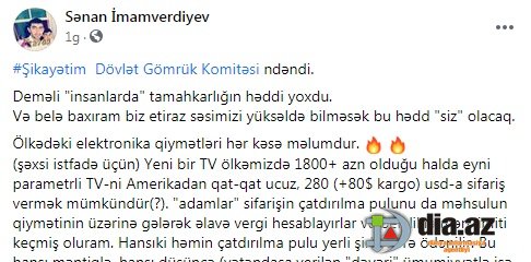 DİA.AZ: - "Şikayətim Dövlət Gömrük Komitəsindəndi. Deməli, "insanlarda" tamahkarlığın həddi yoxdur". DİA.AZ bildirir ki, bu barədə Sənan İmamverdiyev adlı istifadəçi "Müştəriyəm Şikayətim Var" qrupunda paylaşım edib.