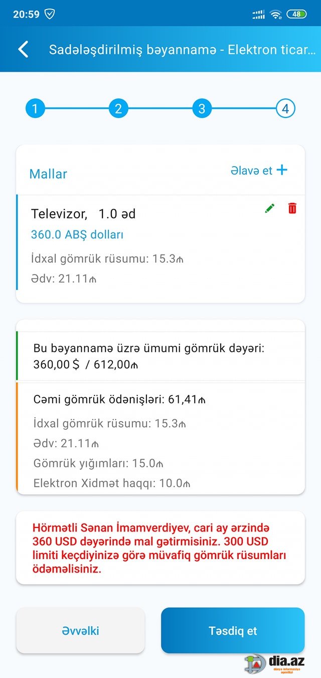Şəxsi istfadə üçün yeni bir televizor ölkəmizdə 1800+ azn olduğu halda eyni parametrli televizoru Amerikadan qat-qat ucuz, 280 (+80$ kargo) dollara sifariş vermək mümkündür(?). "Adamlar" sifarişin çatdırılma pulunu da məhsulun qiymətinin üzərinə gələrək əlavə vergi hesablayırlar və beləliklə mən limiti keçmiş oluram.