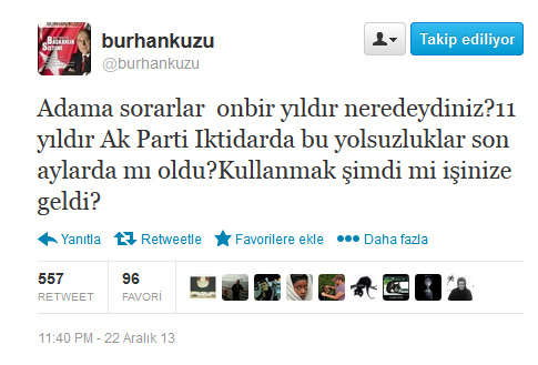“On bir ildir AKP iqtidardadır. Bu rüşvətləri son aylarda almadılar ki? Nə oldu, istifadə etmək indimi işinizə yaradı?” “Axar.az” məlumat verir ki, bu açıqlama ilə Türkiyə Konstitusiya Komissiyasının rəhbəri Burhan Kuzu çıxış edib. Dünən tvitter hesabında bu sözləri yazan B.Kuzu camaatı bu videoları yaymaqda günahlandırıb: “Adamdan soruşarlar: on bir ildir harada idiniz? On bir ildir AKP iqtidardadır. Yoxsa bu rüşvətlər son aylardamı alındı? İstifadə etmək indimi işinizə yaradı?” Qeyd edək ki, AKP nümayəndələri bu günə qədər rüşvət əməliyyatında irəli sürülən bütün faktları inkar edirdilər. - See more at: http://axar.az/news/4870#sthash.SwMPwGnY.dpuf