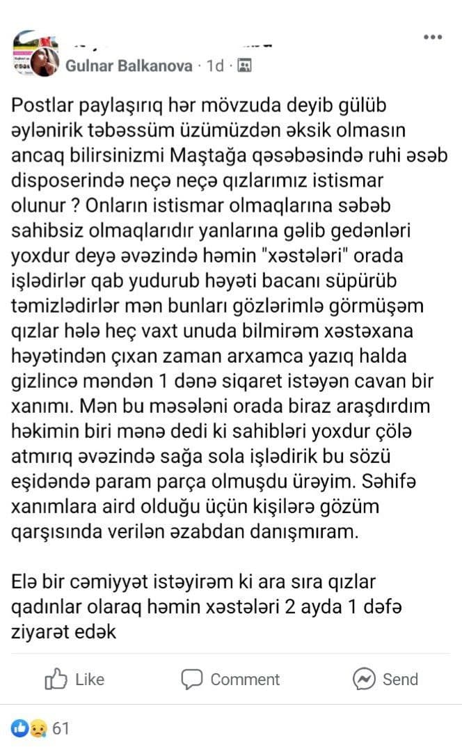 “Mən bunları gözlərimlə görmüşəm, xəstələri orada işlədirlər. Qab yudurur, həyət-bacanı təmizlətdirirlər. Hələ xəstəxana həyətindən çıxanda bir cavan xanım yazıq halda məndən gizlincə siqaret istədi bu hadisəni heç vaxt unutmaram...”