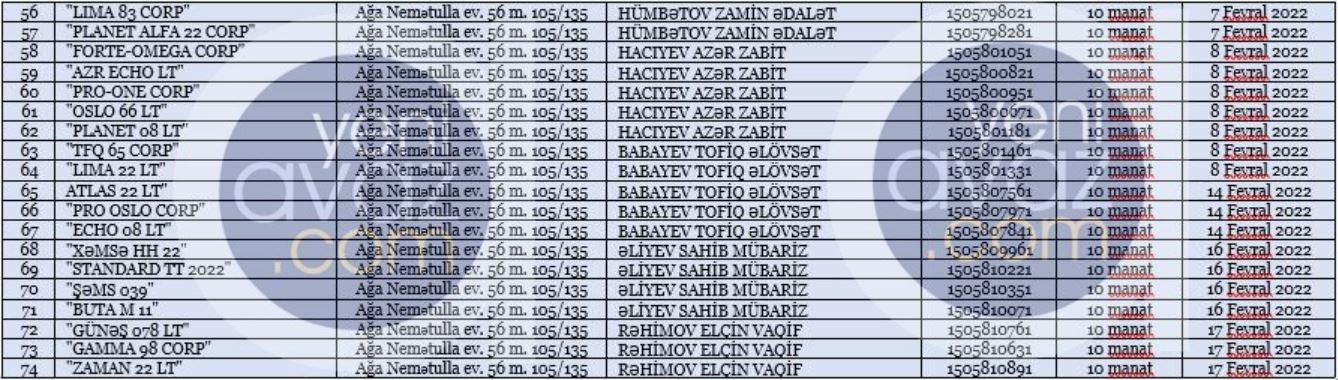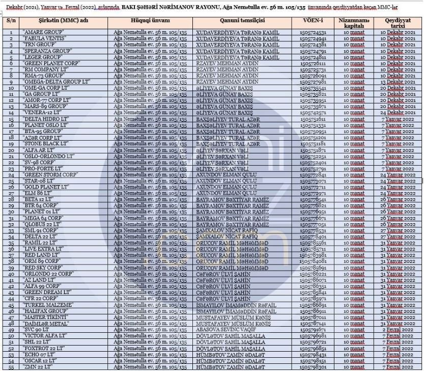 Fövqəladə Hallar Nazirliyinin (FHN) Maddi Texniki-Təchizat İdarəsi tərəfindən keçirilən tender müsabiqəsinin qalibi "Aura 2022 AA” MMC (VÖEN-1505848301) olub. DİA.AZ yeniavaz.com-a istinadla xəbər verir ki, "Aura 2022 AA” MMC FHN-nin sifarişi əsasında nazirliyə güc maşınları və başqa tənzimləyici qurğular satacaq və qarşılığında 196 min 680 manat alacaq. Məlumat üçün bildirək ki, "Aura 2022 AA” MMC tender elanından cəmi 5 ay əvvəl – 16.03.2022-ci il tarixində dövlət qeydiyyatına alınıb. FHN-nin tender elanı avqust ayının 11-də elan olunub. Onu da bildirək ki, "Aura 2022 AA” MMC barədə açıq internet resurslarda heç bir məlumata rast gəlmək mümkün deyil. Cəmi 5 ay əvvəl yaranan və 197 min manatlıq tenderin qalibi olan MMC Bakı şəhəri, Nərimanov rayonu, Ağa Nemətulla, ev 56, m. 105/135 ünvanında qeydiyyatdadır. MMC-nin qanuni təmsilçisi Nurəddinov Mehman Əlihadi oğludur. Maraqlı məqamlardan biri də odur ki, ötən ilin dekabr və bu ilin yanvar-fevral aylarında "Aura 2022 AA” MMC-nin dövlət qeydiyyatına alındığı ünvanda yüzlərlə şirkət qeydiyyata alınıb. Bu şirkətlərin bir-neçəsinin qanuni təmsilçisi də eyni şəxslər olub. Belə ki, “Nərimanov rayonu, Ağa Nemətulla, ev 56, m. 105/135” ünvanda dövlət qeydiyyatına alınan "Aura 2022 AA” MMC -nin qanuni təmsilçisi Nurəddinov Mehman Əlihadi oğlu eyni zamanda "Medıa-039M" MMC-nin (VÖEN - 1505848281) də rəhbəridir. Onu da qeyd edək ki, bu şirkətləri birləşdirən təkcə onların eyni ünvanda qeydiyyatda olması deyil, eyni zamanda şirkət adlarındakı bənzərlik də bu şirkətlərin bir-birilə hansısa əlaqələrinin olduğunu göstərir. Cəmi 3 ay ərzində ötən ilin dekabr və bu ilin yanvar-fevral aylarında “Nərimanov rayonu, Ağa Nemətulla, ev 56, m. 105/135” ünvanda qeydə alınan şirkətlər bunlar olub: