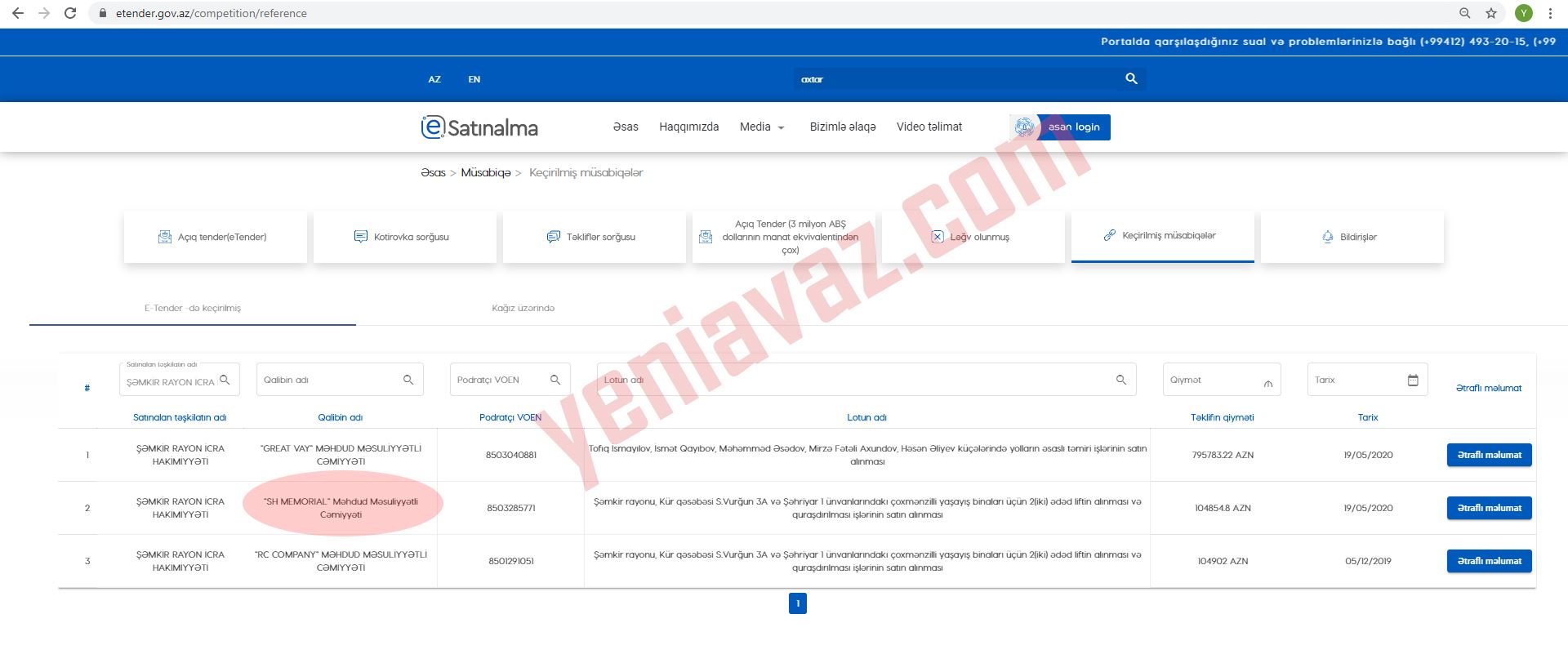 Yeni yaranan və bu səbəbdən də təcrübəsi olmayan şirkətlərin dövlət qurumlarının elan etdiyi tenderlərdə qalib olması dəfələrlə qeydə alınıb. Yeniavaz.com xəbər verir ki, belə tenderlərdən birinin qalibi "SH Memorial" MMC (VÖEN-8503285771) adlı şirkət olub. "SH Memorial" MMC 19.05.2020-ci il tarixində Şəmkir rayon İcra Hakimiyyətinin elan etdiyi tender müsabiqəsinin qalibi elan olunub. Şəmkir rayon İcra Hakimiyyəti "SH Memorial" MMC-yə Kür qəsəbəsi S.Vurğun 3A və Şəhriyar 1 ünvanlarındakı çoxmənzilli yaşayış binaları üçün 2 (iki) ədəd liftin alınması və quraşdırılması üçün 104 min 854 manat 80 qəpik ödəyəcək. Məlumat üçn bildirək ki, Şəmkir rayon İcra Hakimiyyəti tender müsabiqəsini aprel ayının 8-də elan edib. Bu barədə məlumat “Respublika” qəzetində dərc olunub (http://www.respublica-news.az/index.php/dig-r-x-b-rl-r/reklam-v-elanlar/item/26633-tender-elanlari). Maraqlıdır ki, tenderin qalibi olan "SH Memorial" MMC tender elanından cəmi bir həftə əvvəl – 01.04.2020-ci il tarixində dövlət qeydiyyatına alınıb. Onu da bildirək ki, Şəmkir rayon İcra Hakimiyyətinin elan etdiyi tenderin şərtlərində açıq şəkildə qeyd olunub: - Müqaviləni yerinə yetirmək üçün tender iştirakçıları lazımi maliyyə və texniki imkanlara malik olmalıdırlar. - İddiaçının son bir ildəki fəaliyyəti haqqında vergi orqanları tərəfindən təsdiq olunmuş maliyyə hesabatının surəti; - İddiaçının son bir ildəki maliyyə vəziyyəti haqqında bank arayışı; Göründüyü kimi, cəmi bir həftə əvvəl qeydiyyatdan keçən şirkətin son bir ildəki fəaliyyəti barədə hansısa sənəd təqdim etməsi mümkünsüzdür. "Dövlət satınalmaları haqqında" Qanunun 6-cı maddəsində malgöndərənlərin (podratçıların) ixtisasına dair tələblər yer alıb. Həmin maddənin 6.2.1-ci bəndində açıq şəkildə yazılır ki, satınalma müqaviləsinin icrasını təmin etmək üçün müvafiq sahədə peşəkarlığının, təcrübəsinin, texniki və maliyyə imkanlarının, işçi qüvvəsinin, idarəetmə səriştəsinin, etibarlığının olması lazımdır. Cəmi bir-neçə gün əvvəl yaranan, bu şirkətin hansı peşəkarlığa və təcrübəyə sahib olacağı aydın deyil. Qiymət necə şişirdilib? Şəmkir rayon İcra Hakimiyyətinin keçirdiyi və "SH Memorial" MMC-nin qalib olduğu tenderlə bağlı diqqət çəkən başqa bir məqam isə satın alınan mal və xidmətin qiymətilə bağlıdır. Şəmkir rayon İcra Hakimiyyəti heç bir təcrübəsi olmayan "SH Memorial" MMC-yə “gücü 400 kq, sürət 1m/s” olan iki ədəd liftin satın alınması və qurşadırılması üçün 104 min 854 manat 80 qəpik ödəyəcək. Bu isə o deməkdir ki, bir ədəd liftin qiyməti 52 min 427 manat 40 qəpik olacaq. Qeyd edək ki, hazırda daxili bazarda “gücü 400 kq, sürət 1m/s” olan liftin orta bazar qiyməti 30-35 min manat arasında dəyişir. Elan saytlarında bu barədə kifayət qədər məlumat var. Halbuki, "Dövlət Satınalmaları Haqqında" Qanunun 27.4-cü maddəsində açıq şəkildə yazılır ki, hər hansı təklifin qiyməti müvafiq malların (işlərin və xidmətlərin) ehtimal olunan qiymətindən (orta bazar qiyməti) yüksək olarsa, satınalan təşkilat həmin təklifi satınalma prosedurlarından kənarlaşdırır. Əlaqələndirici şəxslə əlaqə saxlamaq mümkün deyil… Qeyd edək ki, tender elanında əlaqələndirici şəxs olaraq göstərilən və əlaqə saxlamaq üçün elana mobil nömrəsi (050 575 55 95) yazılan Şəmkir rayon İcra Hakimiyyətinin baş mühasibi Habil Hüseynovdan məsələ ilə bağlı açıqlama almaq cəhdimiz baş tutmadı. Baş mühasibə dəfələrlə zəng etməyimizə baxmayaraq telefon zənglərimizə cavab vermədi. Adı olub özü olmayan daha bir şirkət… Şəmkir rayon İcra Hakimiyyəti ötən ilin dekabr ayında da bənzər tender keçirib və qalib şirkət “RC COMPANY” MMC olub. “SH Memorial" MMC kimi “RC COMPANY” MMC-də Kür qəsəbəsi S.Vurğun 3A və Şəhriyar 1 ünvanlarındakı çoxmənzilli yaşayış binaları üçün 2 (iki) ədəd liftin alınması və quraşdırılması üçün Şəmkir rayon İcra Hakimiyyətindən 104 min 902 manat alıb. Bu şirkət 2016-cı ildə dövlət qeydiyyatına alınsa da bugünə kimi lift satışı və quraşdırılmasında hansı təcrübəyə sahib olduğu barədə heç bir məlumat yoxdur.