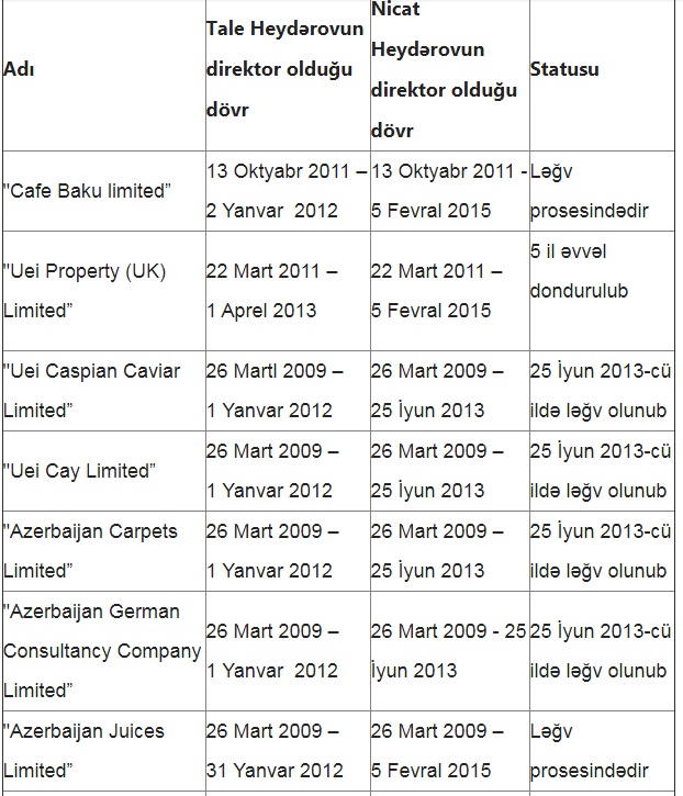Məlumat üçün bildirək ki, vaxtı ilə Londonda Tale və Nicat Heydərov qardaşlarının rəhbərlik etdiyi şirkətlərin əksəriyyəti bağlanıb. Hazırda yalnız iki şirkət - “United Enterprises İnternational Limited” və “Uei Restaurants Limited” şirkətləri öz fəaliyyətlərini davam etdirirlər. "Uei Property (UK) Limited” şirkəti isə 5 il əvvəl öz fəaliyyətini dondurub. Digər şirkətlərdə oldğu kimi bu şirkətlərə də Gillian Ralston Jordan rəhbərlik edir.