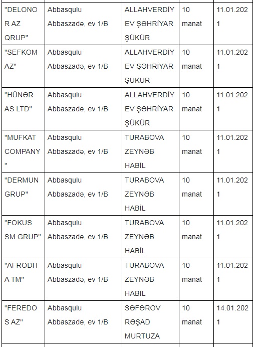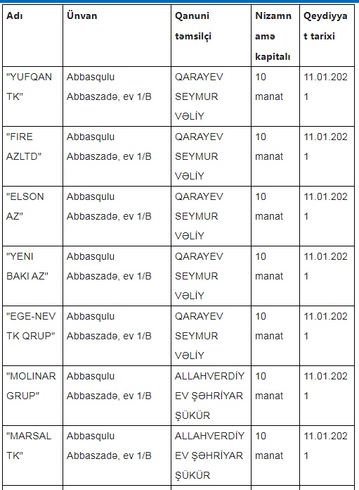 Qaçqınlar və Məcburi Köçkünlərin İşləri üzrə Dövlət Komitəsinin (“Qaçqınkom”) Repatriasiya Departamenti tərəfindən keçirilən tender müsabiqələrinin qalibi məlum olub. Yeniavaz.com açıqlanan rəsmi məlumatlara istinadən bildirir ki, tender müsabiqələrinin qalibi “Mufkat Company” MMC (VÖEN-1702978111) olub. “Qaçqınkom” məcburi köçkün ailələrinin köçürülməsi üçün “Mufkat Company” MMC ilə 15 min 540 manatlıq müqavilə bağlayıb. Məlumat üçün bildirək ki, “Doraqon” MMC – 11.01.2021-ci il tarixində dövlət qeydiyyatına alınıb. “Qaçqınkom” tender müsabiqəsini 30.03.2021-ci il tarixində elan edib. Bu isə o deməkdir ki, tender müabiqəsinin qalibi olan MMC tender elanının verilməsindən cəmi 2 ay 20 gün əvvəl yaranıb. Cəmi 2 ay 20 gün əvvəl yaranan və 15 min manatlıq tenderin qalibi olan MMC “Bakı şəhəri, Səbail rayonu, Abbasqulu Abbaszadə, ev 1/B” ünvanında qeydiyyatdadır. Nizamnamə kapitalı 10 manat olan MMC-nin qanuni təmsilçisi Turabova Zeynəb Habil qızıdır. Qeyd edək ki, 11.01.2021-ci il tarixlərində “Bakı şəhəri, Səbail rayonu, Abbasqulu Abbaszadə, ev 1/B” ünvanında Turabova Zeynəb Habil qızının qanuni təmsilçi olduğu “Afrodıta TM”, “Fokus SM Grup” və “Dermun Grup” adlı daha 3 şirkət qeydiyyatdan keçirib. Maraqlı məqamlardan biri də odur ki, son aylarda “Səbail rayonu, Abbasqulu Abbaszadə, ev 1/B” ünvanında onlarla şirkət qeydiyyata alınıb. Bu şirkətlərin bir-neçəsinin qanuni təmsilçisi eyni şəxslər olub. “Səbail rayonu, Abbasqulu Abbaszadə, ev 1/B” ünvanda qeydə alınan şirkətlərin bəziləri bunlar olub:
