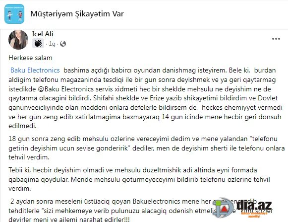 DİA.AZ: - ""Baku Electronics"in başıma açdığı biabırçı oyundan danışmaq istəyirəm". DİA.AZ bildirir ki, bu barədə "Müştəriyəm Şikayətim Var" sosial qrupundakı paylaşımında İcel Ali adlı istifadəçi giley edir.