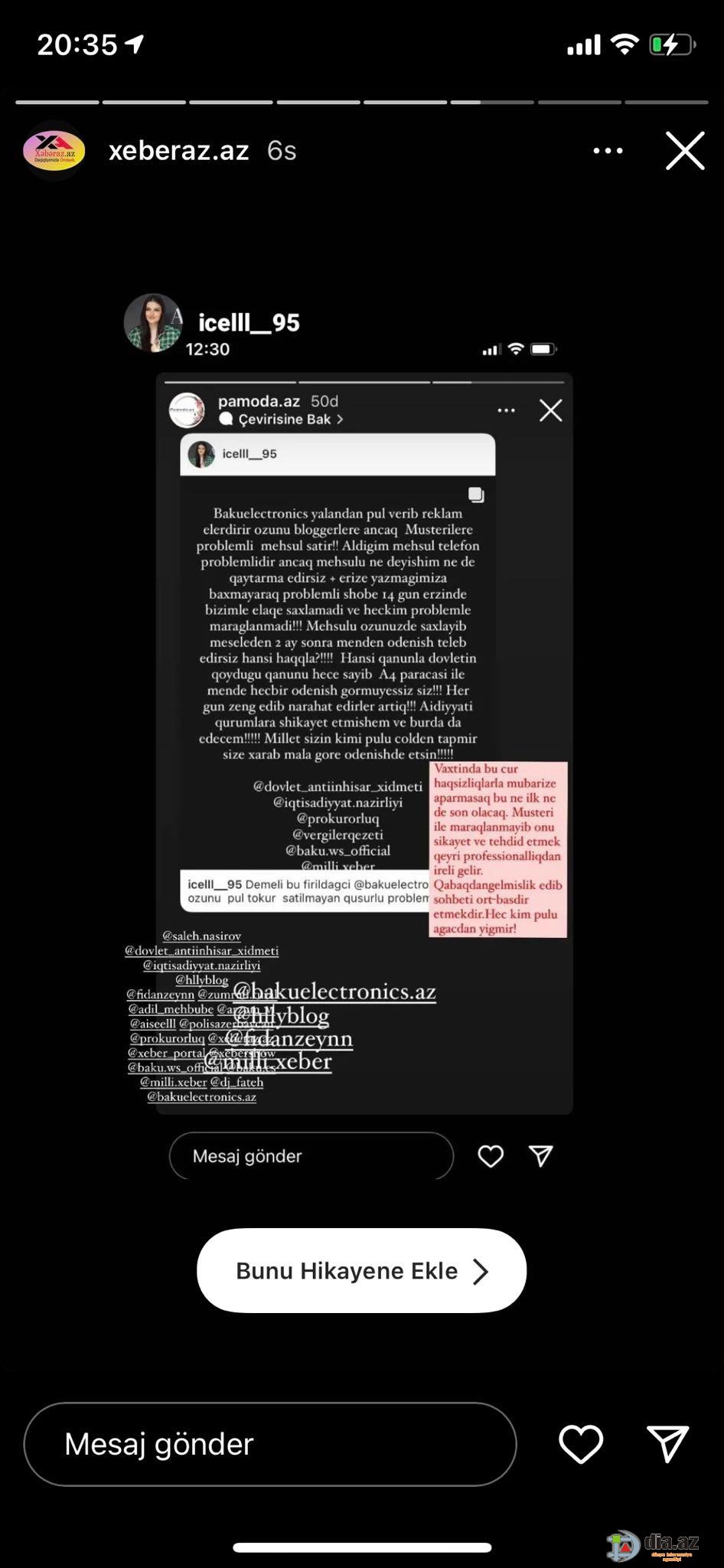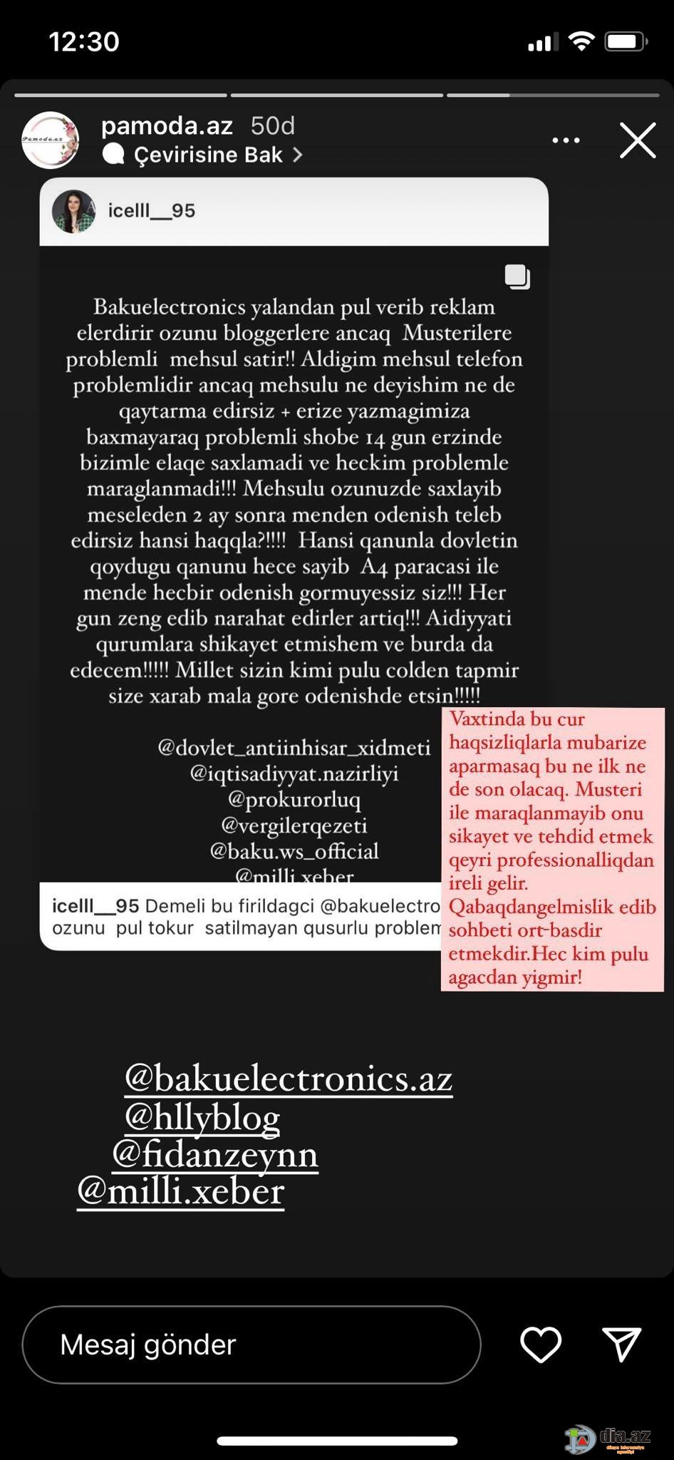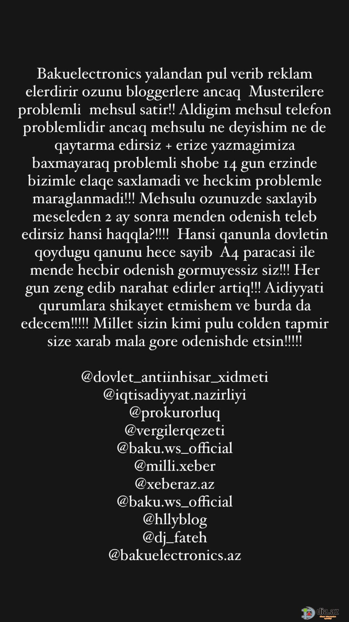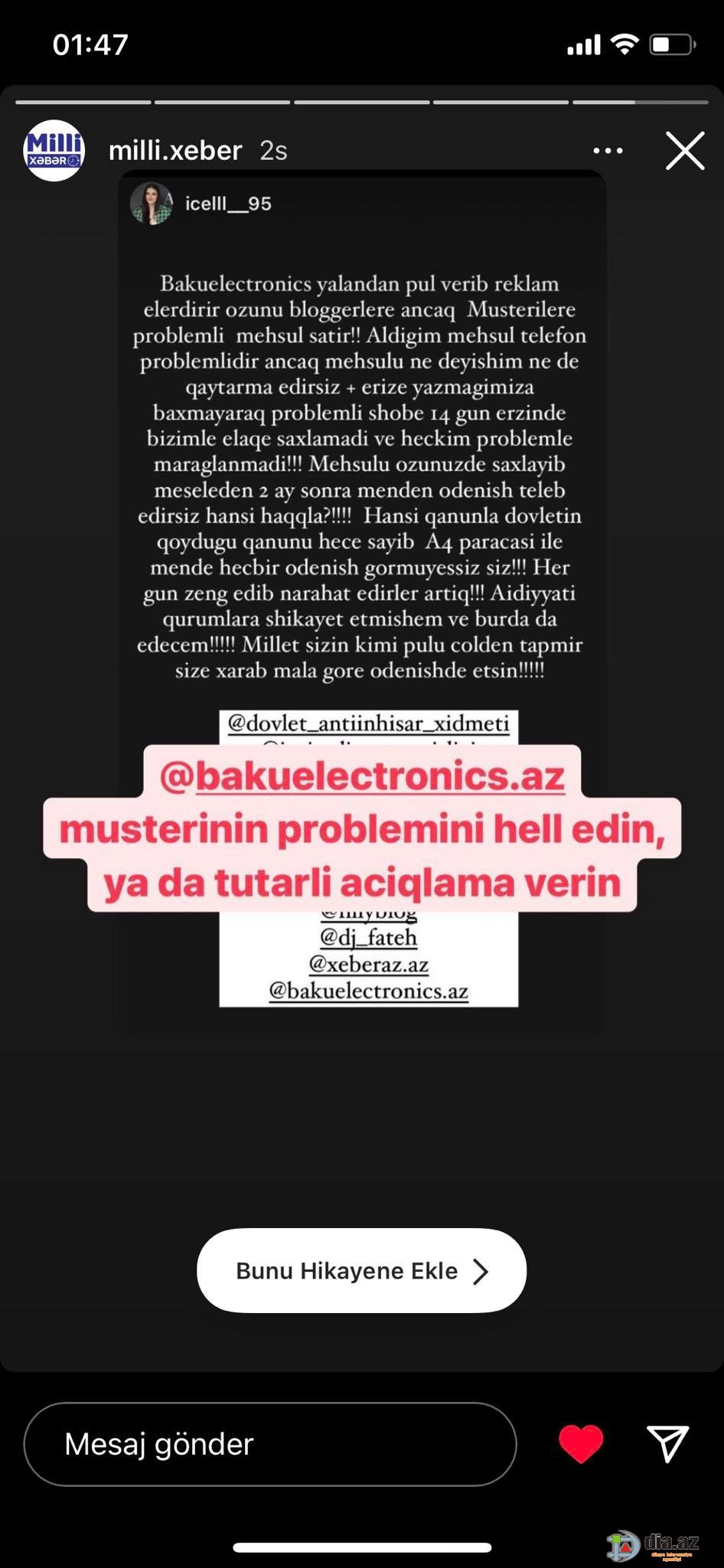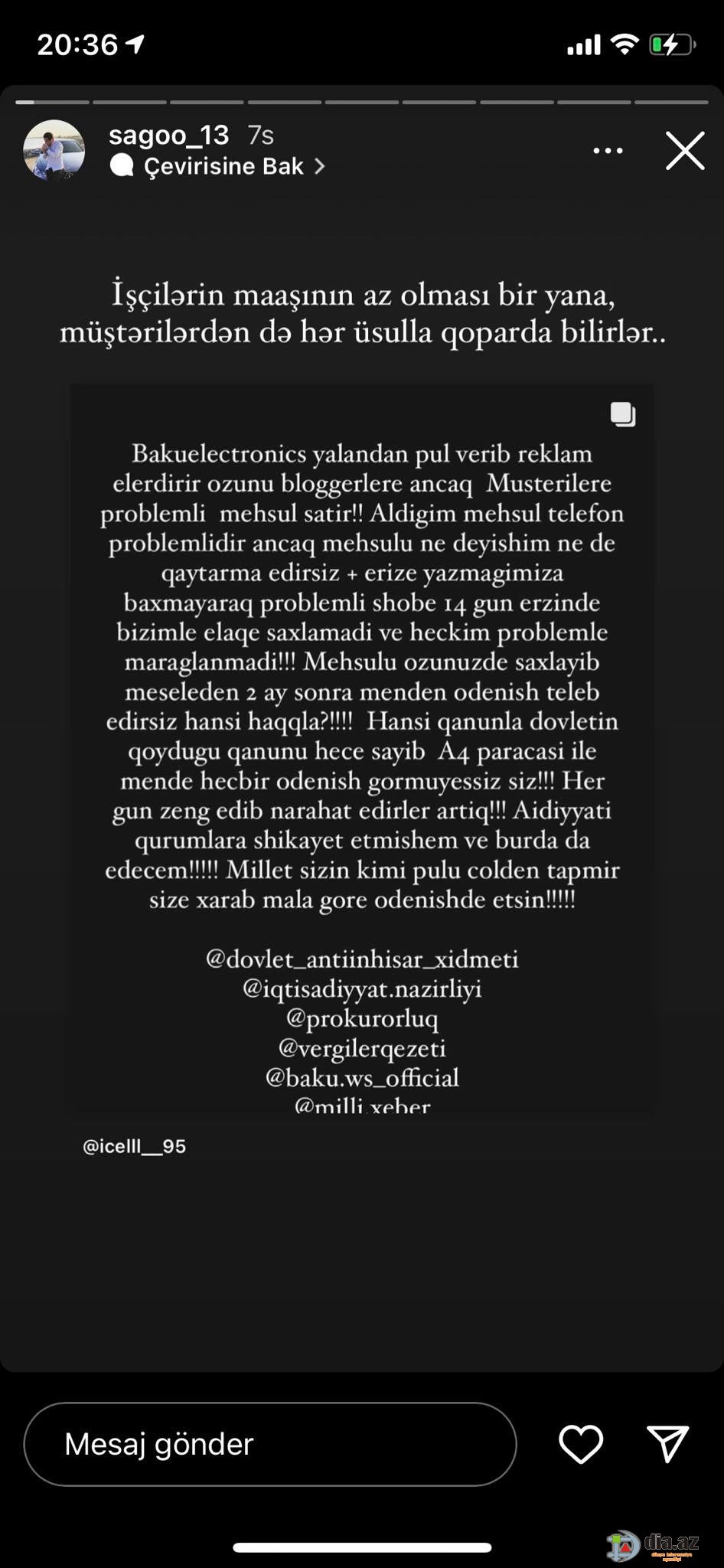 Beləlilklə, vətəndaş şikayətini belə davam edir: "Bele ki, burdan aldigim telefonu magazaninda tesdiqi ile bir gun sonra deyishmek ve ya geri qaytarmag istedikde @Baku Electronics servis xidmeti hec bir sheklde mehsulu ne deyishim ne de qaytarma olacagini bildirdi. Shifahi sheklde ve Erize yazib shikayetimi bildirdim ve Dovlet qanunveeicliyinde olan maddeni onlara defelerle bildirsem de, heckes ehemiyyet vermedi ve her gün zeng edib xatirlatmagima baxmayaraq 14 gun icinde mene hecbir geri donsuh edilmedi. 18 gun sonra zeng edib mehsulu ozlerine vereceyimi dedim ve mene yalandan “telefonu getirin deyishim ucun sevise gonderirik” dediler, men de deyishim sherti ile telefonu onlara tehvil verdim. Tebii ki, hecbir deyishim olmadi ve mehsulu duzeltmishik adi altinda eyni formada qabagima qoydular. Mende mehsulu goturmeyeceyimi bildirib telefonu ozlerine tehvil verdim. 2 aydan sonra meseleni üstüaciq qoyan Bakuelectronics mene her gun zeng edib tehditlerle “sizi mehkemeye verib pulunuzu alacagiq odenish etmelisiz bize” kimi sozler deyirler meni ve ailemi narahat edirler!!! Menden hansi mehsulun odenishini ve hansi haqqla odenish teleb edirler ozleride bilmir ve shirket daxilinde gunahi bir birilerinin ustlerine atirlar!!! Sistemi olmayan ve problem ile aylarla maraglanmayam bir “Shirket” @bakuelectronics problem helline gore bir defe olsun mushteriye zeng etmir ancaq 2 ay sonra elaqesiz sehklde menden odenish teleb edir!!!! Aidiyyati qurumlara shikayetimi bildirmishem ve burada da bildirecem!!! Shikayetimi bura yazmamishdan evvel sehifeye goz gezdirende bu biabirciligin ve bunlarin ilk bele mushteri shikayeti olmadigini gordum nece bele menim kimi shikayetci mushteri var imis hamisi da mehkeme yolu ile haqqlarini soke-soke aliblar!!! Meseleni instagramdada ictimaileshdirmishem burada da haqqimi teleb edecem sizinle mehkemede gorusheceyik!!! Her kes bu magazanin nece bir yer oldugunu bilsin"