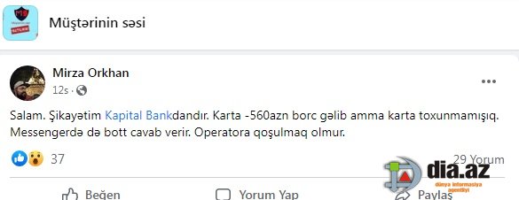 "Şikayətim "Kapital Bank"dandır". DİA.AZ bildirir ki, bunu "Müştərinin Səsi" sosial qrupundakı paylaşımında Mirzə Orxan adlı istifadəçi yazır.