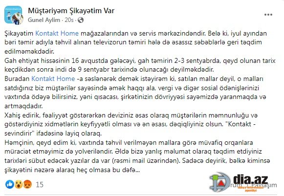 DİA.AZ: - "Şikayətim "Kontakt Home" mağazalarından və servis mərkəzindəndir". DİA.AZ bildirir ki, bu barədə "Müştəriyəm Şikayətim Var" sosial qrupundakı paylaşımında Günel Aylim adlı istifadəçi giley edir.