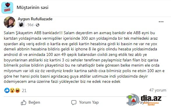 Daha sonra narazı vətəndaş yazır (vətəndaşın yazdıqlarını olduğu kimi təqdim edirik, hərif səhvlərinə toxunmadan -diaaz.space): "ABB eyni bu kartdan yoldaşimada vermişdiler içerisinde 300 azn yoldaşimda bir tek mehledeki araz spardan aliş veriş edirdi o kartla eve geldi kartin hesabina girdi ki baxsin ne var ne yox demeli abbnin hesabina bildiris geldi ki iphone 8 ile giris olindu hesaba yoldasimdada android di ve anindada 100 azn 49 qepik balansdan cixildi zeng etdik tez abb ye boyunlarinan atdilarki siz kartini 3 cü sehsler terefinen paylaşmisiz falan filan biz qarisa bilmerik polise bildirin şikayetinizi bu ne rahatliqdir bele göresen belke menim ele orda milyonum var idi siz öz verdiyniz kredir kartina sahib cixa bilmirsiz polis ne etsin 100 azn e göre her hansi polis basni agridacaq guya atdilar ustimuze indi yoldasimda deyir ödemiyecem ama üzerine faizi yükleyecler biz ne edek nece edek..."