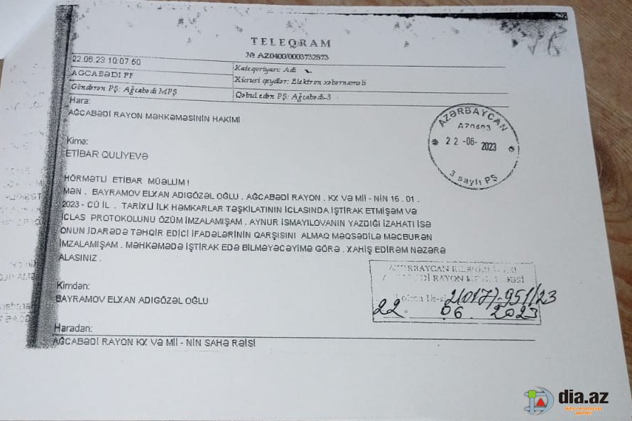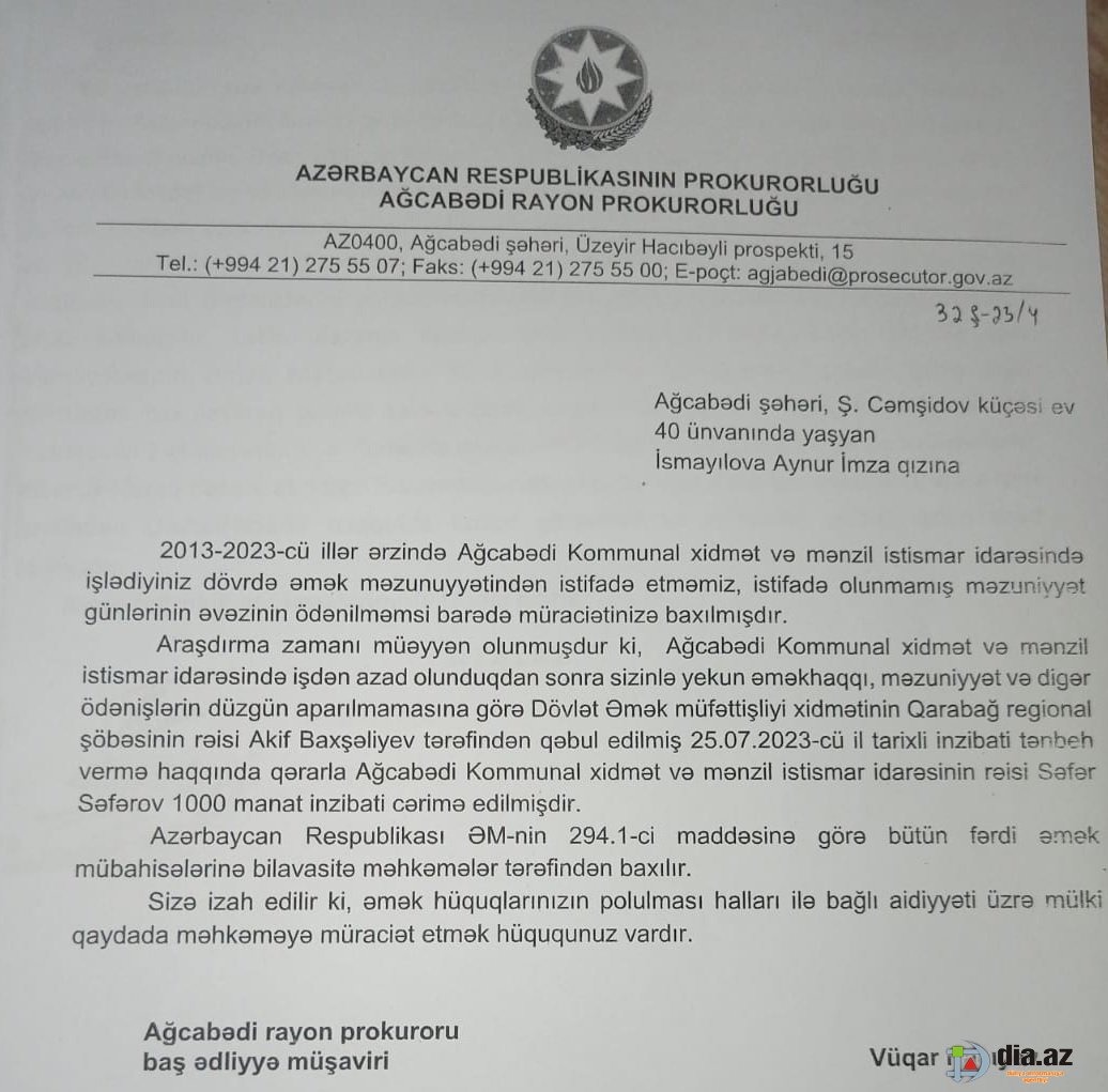 “Mən, İsmayılova Aynur İmza qızı, yazaraq bildirirəm ki, 2023-cü ildə Kommunal Xidmət və Mənzil İstismar İdarəsinə müdir təyin olunan Səfər Səfərov məni və bir neçə işçini işdən çıxardı. Mənim və digər iş yoldaşlarımın məzuniyyət pullarımızı vermir.