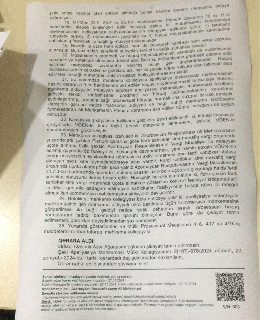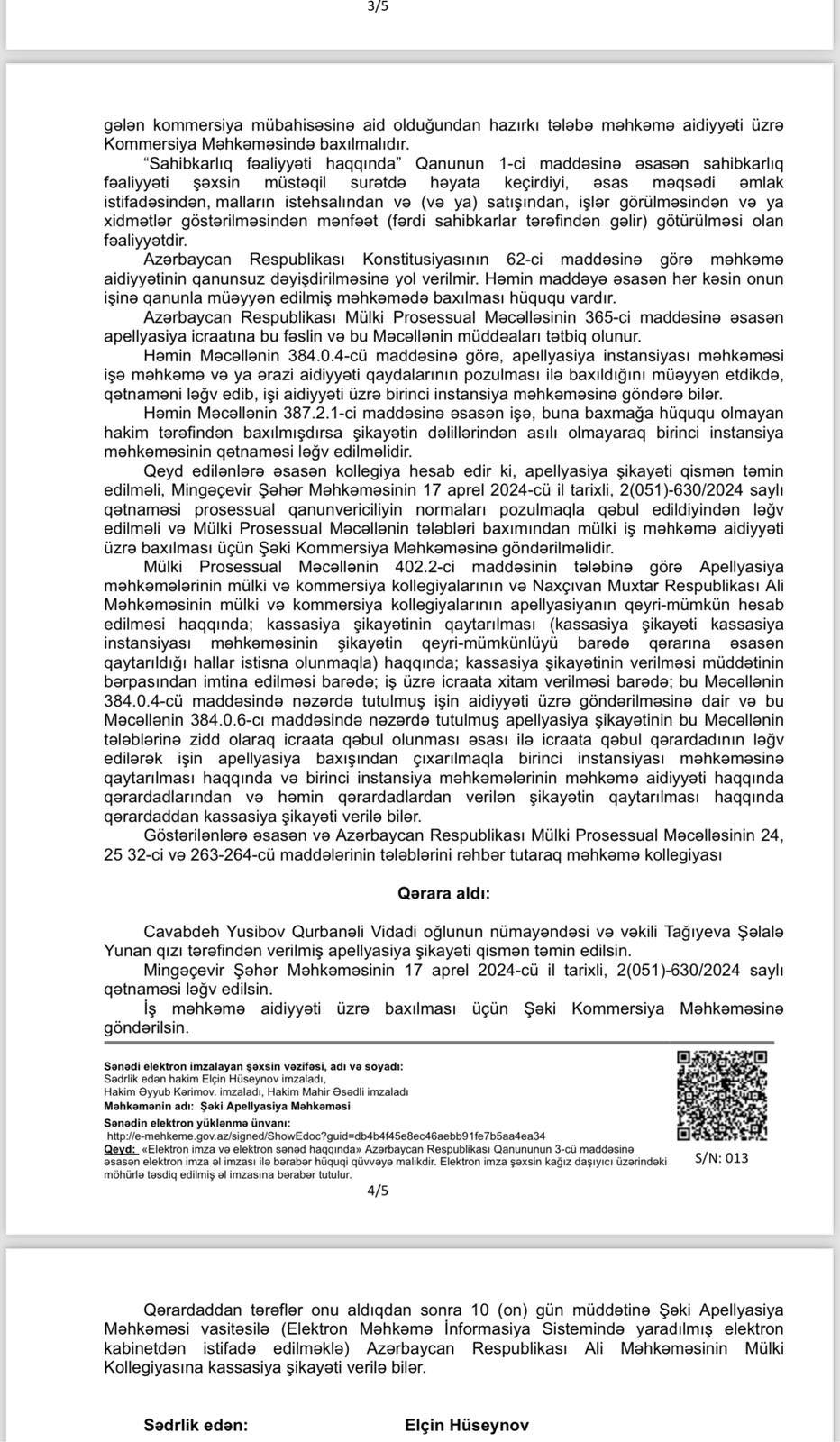 Yuxarıdakı sənədlərdən də aydın olur ki, Mingəçevir məhkəməsinin qərarını Şəki Apelyasiya məhkəməsi ləğv edib, Ali məhkəmə də Qurbanəli Yusibovun xeyrinə qərar çıxaraq, onu qüvvədə saxlayıb. Bu durumda Azər Qasımlı sözügedən məhkəmələri uduzmuş görünür...