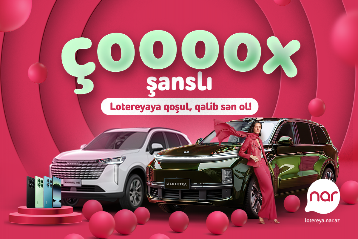 Sərfəli mobil operator “Nar” ilsonunda abunəçilərinə sevinc bəxş etmək üçün onları möhtəşəm hədiyyələrlə dolu “Çoox Şanslı” lotereyasına qoşulmağa dəvət edir. 31 dekabra qədər davam edəcək bu xüsusi lotereya çərçivəsində “Nar” istifadəçiləri hər gün “Xiaomi Redmi Note 14 Pro” smartfonu, hər həftə “Haval H6 Ultra” avtomobili və finalda isə “Li L9 Ultra” avtomobilini qazanmaq imkanı əldə edəcəklər.