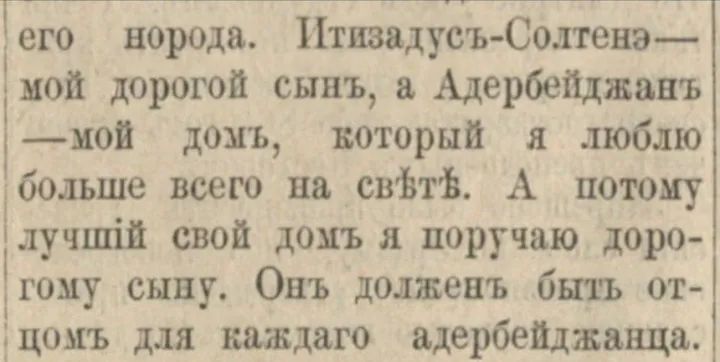 " Mən ən əziz varlığımı (oğlumu) ən əziz yerimə (Azərbaycana) əmanət edirəm.Azərbaycan mənim evimdir, onu dünyada hər şeydən çox sevirəm... O, hər bir azərbaycanlı üçün ata olmalıdır.Mən özüm otuz yeddi illik hakimiyyətim dövründə azərbaycanlılara ata kimi yanaşmışam. İtizadus-Soltane mənim nümunəmi izləməlidir."