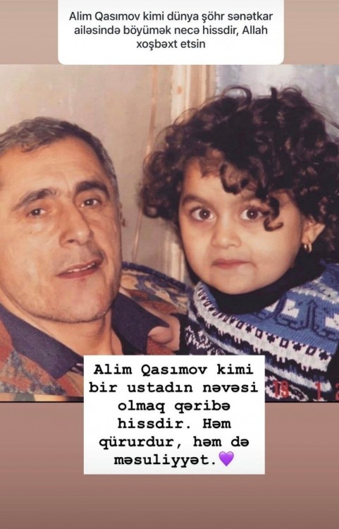 Axşam.az xəbər verir ki, o, sosial media hesabında ona ünvanlanan "Alim Qasımov kimi dünya şöhrətli sənətkarın ailəsində böyümək necə hissdir" sualını cavablayıb.