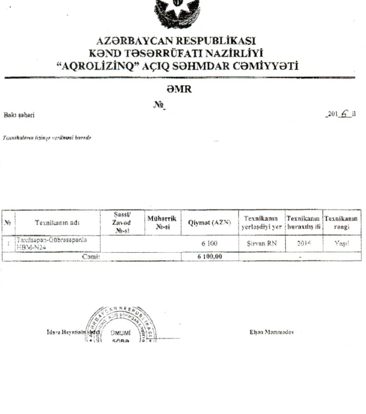 Heydər Əsədov taxılsəpən aqreqatın alışında 5 250 000 manat mənimsəyib - İTTİHAM VAR